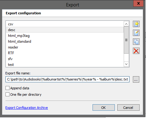 %APPDATA%\Mp3tag\data\action\&1 Rename Relocate Extras Title.mtaUpdate lines 3, 15, 22 with the path to your Plex\Audiobookfolder%APPDATA%\Mp3tag\export\001 Generate.mteUpdate line 1 with your windows usernameC:\Users\your-username-here\...%APPDATA%\Mp3tag\export\desc.mteUpdate line 1 with the path to your Plex\Audiobookfolder%APPDATA%\Mp3tag\export\reader.mteUpdate line 1 with the path to your Plex\Audiobookfolder
