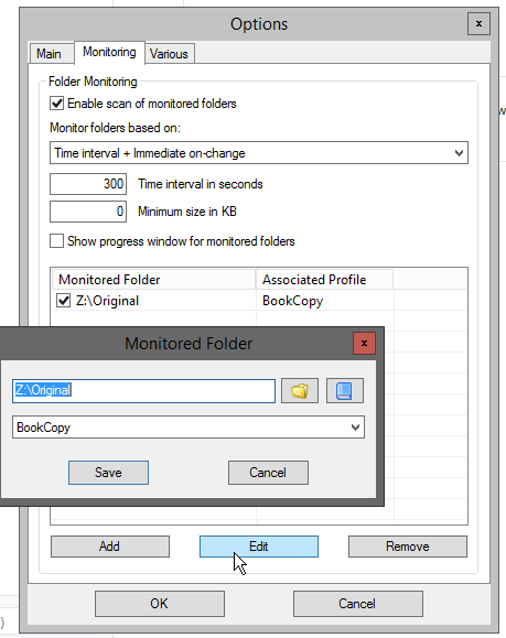 Optionswindow, go to theMonitoringtab and editZ:\Originalwith your specific folder