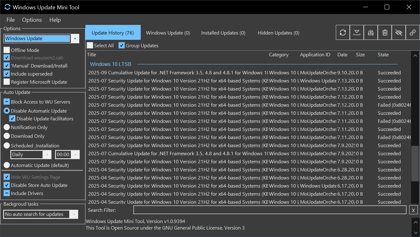 Windows Update Mini Tool is a tool to manage updates of Microsoft products on the Windows operating system.
