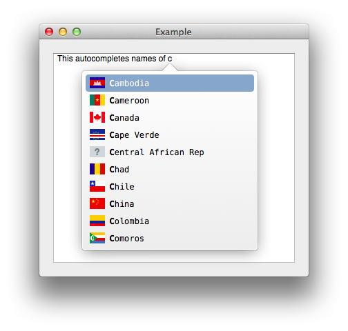 wordlistproperty, I now use the same delegate API that Apple uses for autocomplete. There are now two (optional) delegate methods:textView:imageForCompletion:andtextView:completions:forPartialWordRange:charRange indexOfSelectedItem:. The first is just a slightly different name for the delegate method that supplies images for word completions. The second is how you now supply an array of completions for a partial word and should work the same way it does in Apple's implementation. See the included app for an example of how to use it or look online.