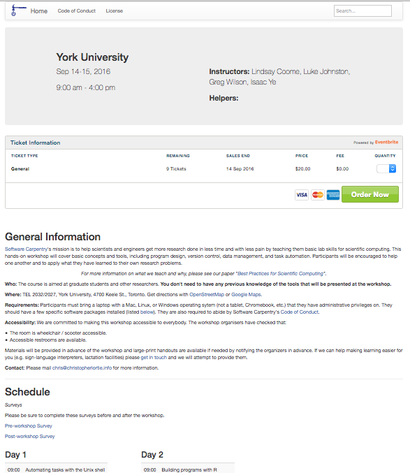 Once you are satisfied with the edits to your site, commit and push the changes to your repository. A few minutes later, you can go to the GitHub Pages URL for your workshop site and preview it. In the example above, this is https://gvwilson.github.io/2016-12-01-oomza. The finished page should look something like this.