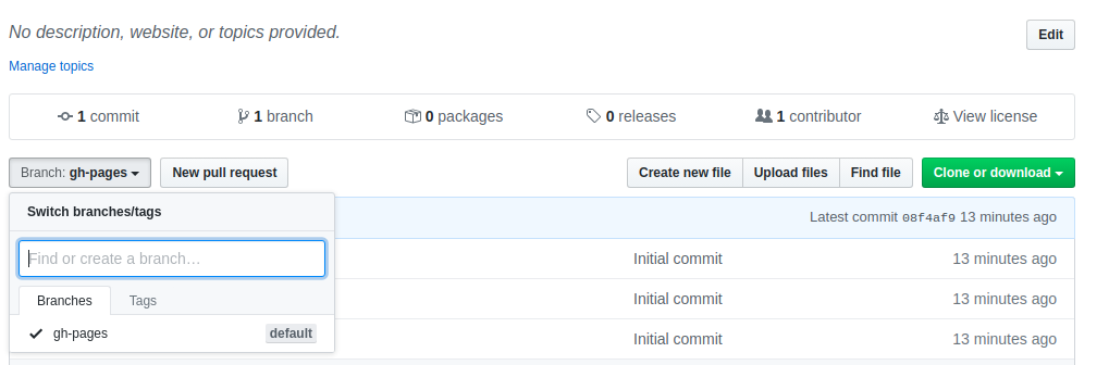 2. Ensure you are on the gh-pages branch by clicking on the branch under the drop down in the menu bar (see the note below):