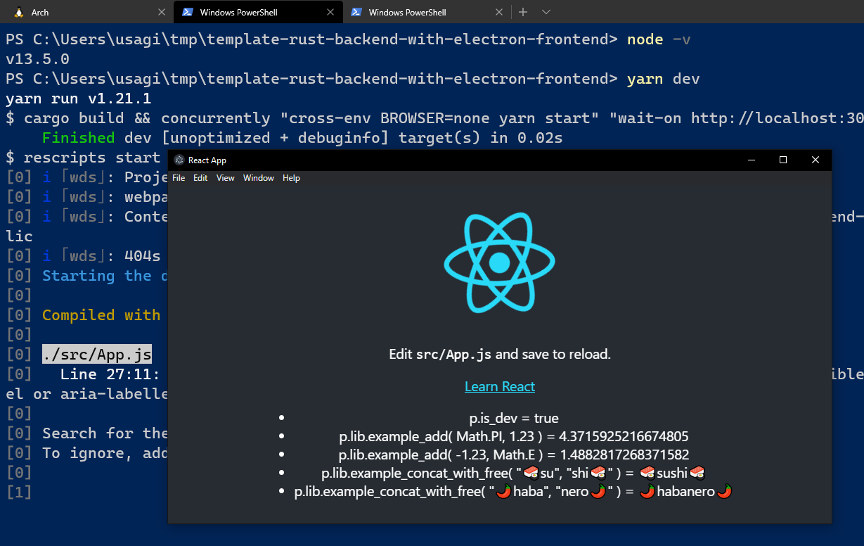 Rustnative code library project for backend business logicsNode.jswithreact+rescripts+electron+electron-rebuildfor frontend presentation logics- -> see also