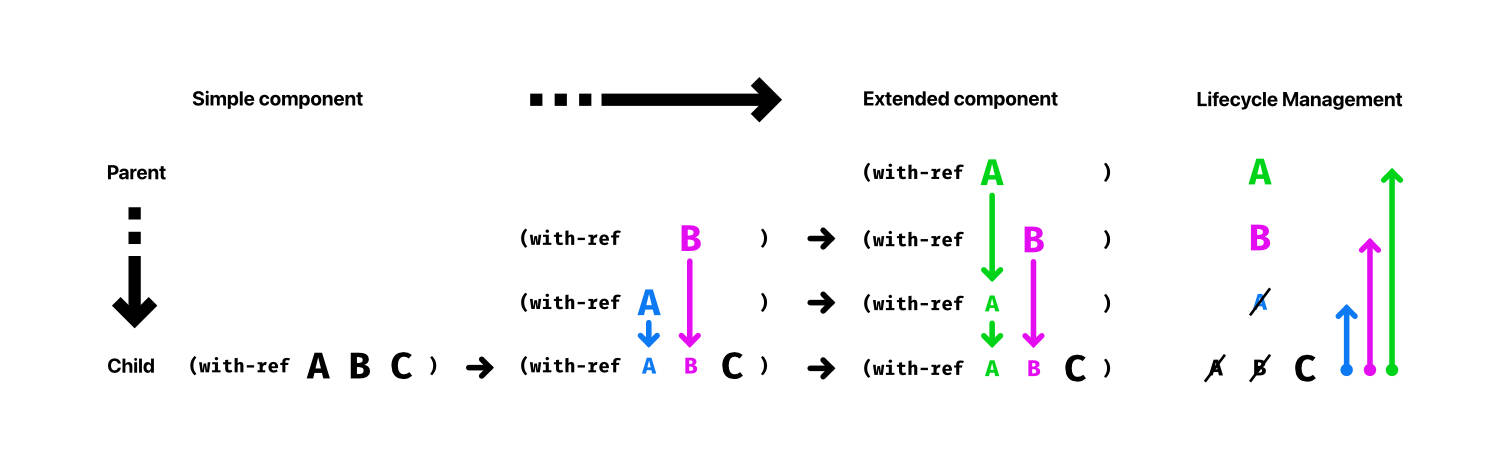 with-ref: "I declare referencesA,B, andC. This is everything I need to function. I'm in charge ofA,B, andCand will manage lifecycle behaviours, like cleanup." -